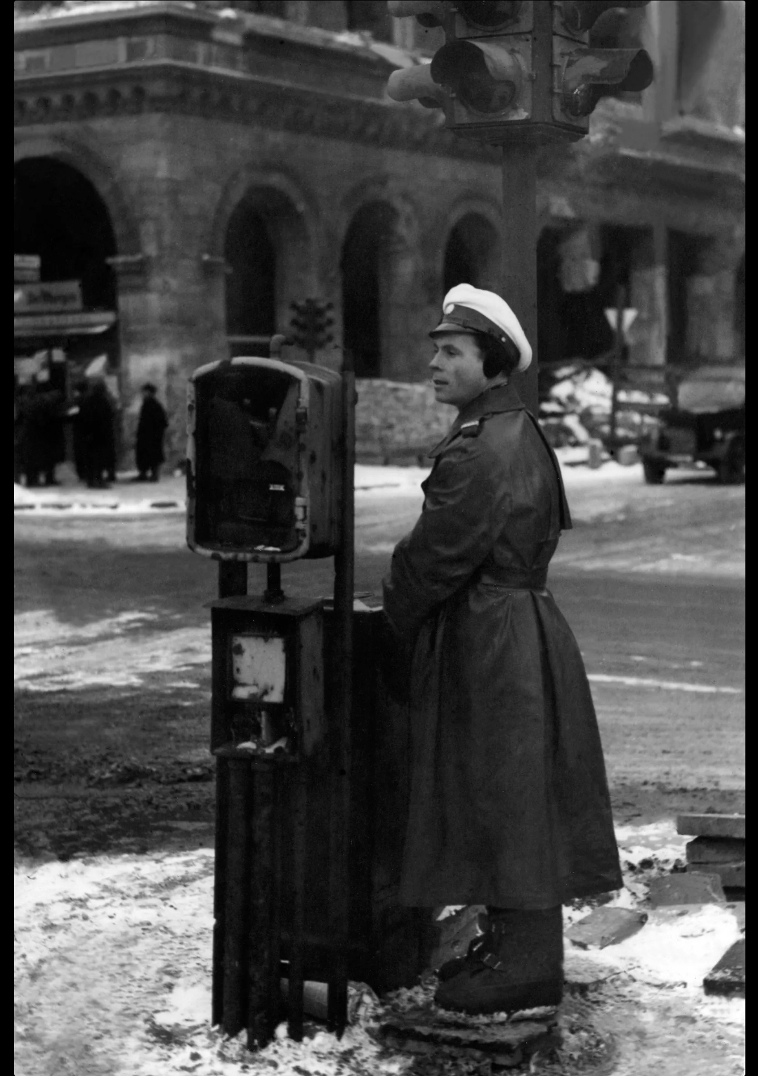특수 고무신: 서베를린의 이 교통경찰은 신호등을 조작할 때 추위로부터 보호해 주는 특수 펠트 신발을 신었습니다(1947년 2월 사진).사진: ullstein 사진