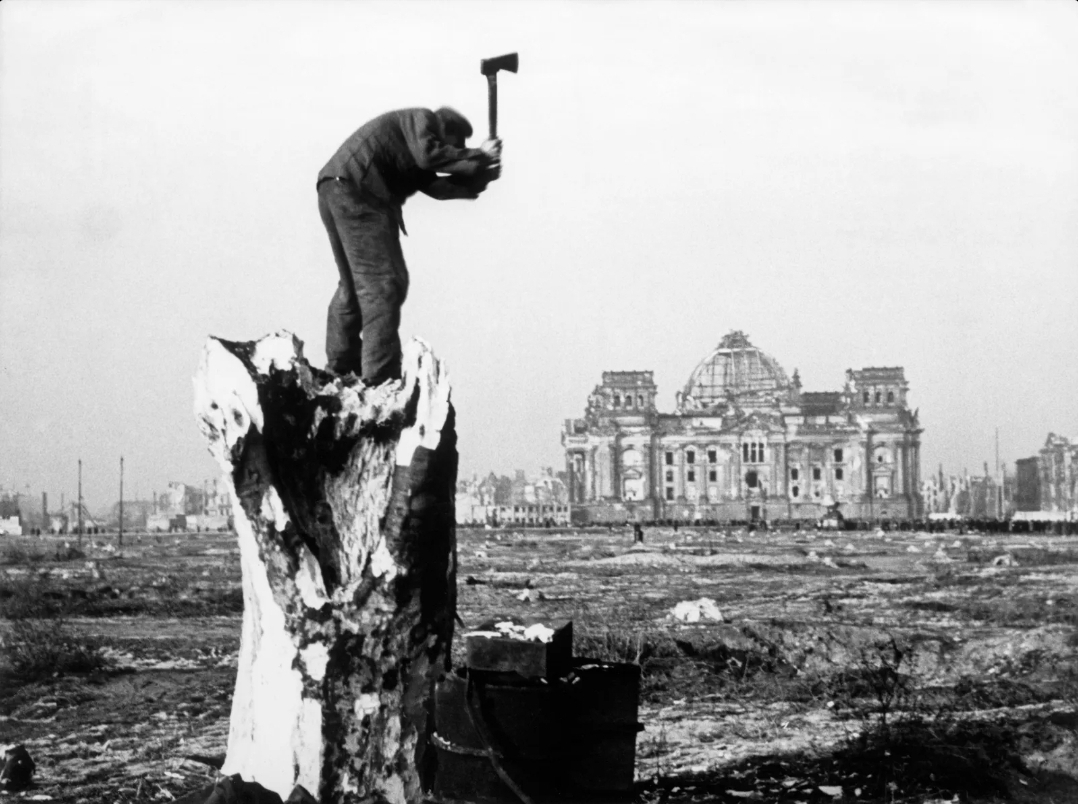 가연성 물질을 찾는 모습: 이 남자가 베를린 티어가르텐에서 나무 그루터기에서 나무를 자르고 있다. 배경에는 국회의사당이 보인다. 1946/47년의 몹시 추운 겨울에 집을 덥히기 위해 사람들은 나무를 베고 석탄을 훔치는 것 외에는 다른 대안이 없었습니다. 석탄 열차 전체가 체계적으로 약탈당했으며, 쾰른 지역에서는 하루에 18,000퀸탈이 도난당한 적도 있었습니다. 결과: 군사 정부는 무장한 인원을 배치해 열차를 보호했습니다. 사진: ullstein 사진