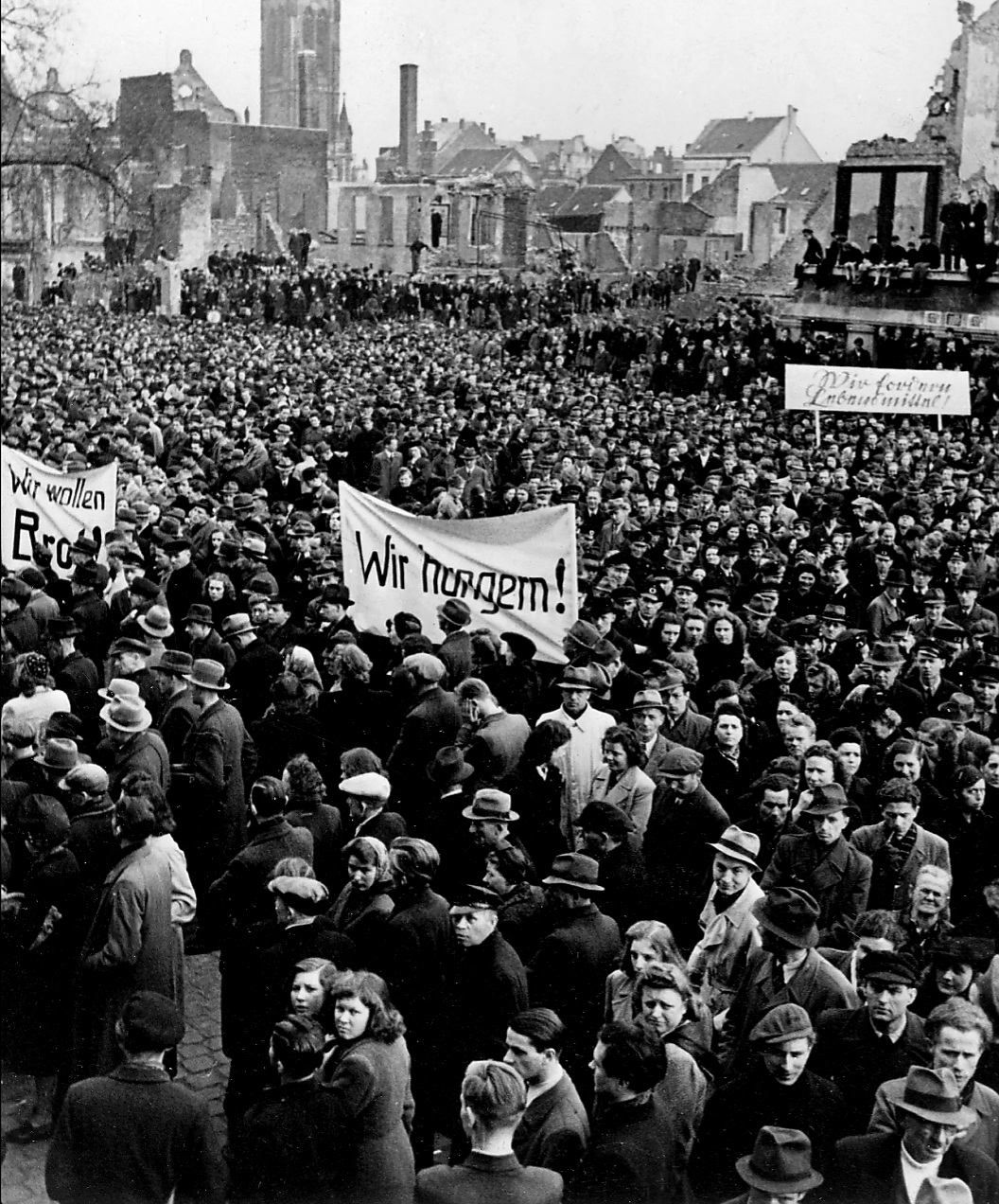"우리는 음식을 요구한다": 대규모 시위(1947년 크레펠트 시위)는 서방 연합국 사이에서 공산주의 쿠데타에 대한 두려움을 불러일으켰습니다. 1947년 6월 5일, 미국 국무장관 조지 마셜은 하버드 대학 학생들에게 한 연설에서 유럽에 대한 원조 프로그램을 설명했습니다. 마셜 플랜은 서부 지역의 신속한 재건과 꾸준한 강화로 이어졌습니다. 사진: ullstein 사진