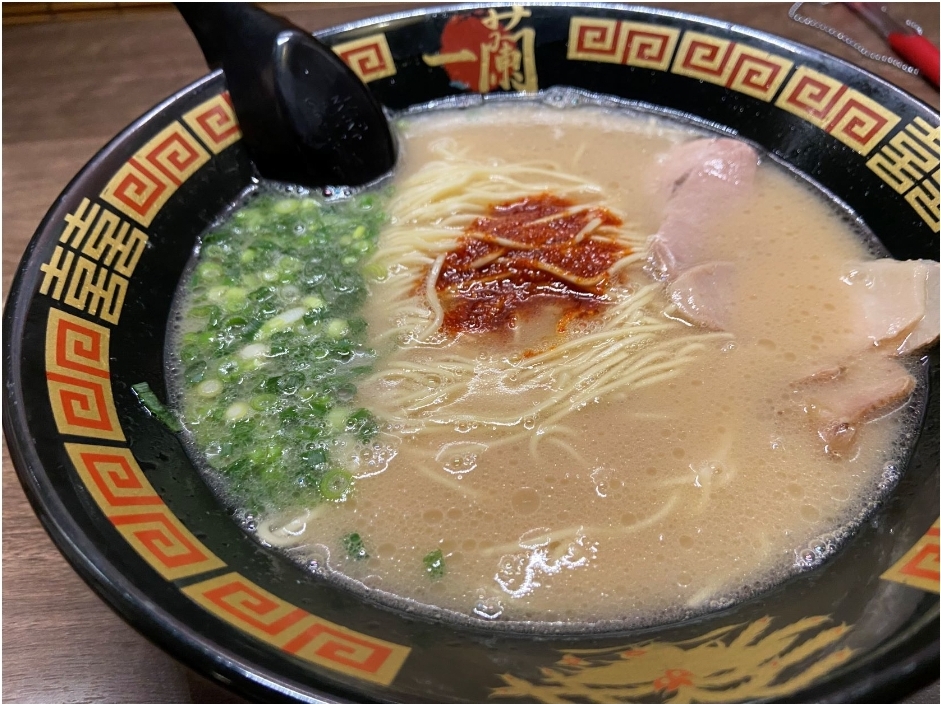 후쿠오카 하면 역시 돈코츠(豚骨) 라멘! 이치란라면의 국물은 돼지뼈를 오랜 시간 고아낸 덕분에 깊고 진한 풍미가 살아있어요. 첫 입을 딱 먹으면, 뼈를 우려낸 진득한 국물이 입 안 가득 퍼지는데, 진짜 ‘라멘의 본고장’에 온 느낌이 물씬 든답니다 😋