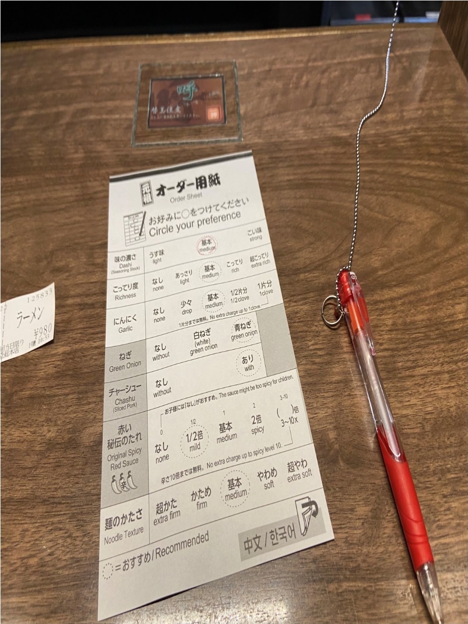 취향 맞춤 주문서 작성: 매장 안에 들어가면 자리에 앉기 전에 주문서를 건네받는데, 면의 단단함부터 국물 농도, 마늘 양, 파, 챠슈(차슈) 여부, 그리고 비밀 소스의 양까지 기입하게 됩니다.